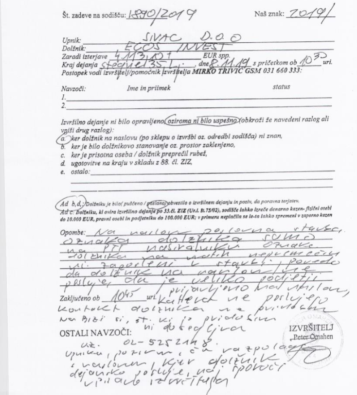 "Sodišče je že lani razsodilo, da nam mora Ecos Inves d.o.o. plačati 3.833,02 evra ter pripadajoče stroške in obresti. Sedaj dejansko rubimo poštni nabiralnik v Ljubljani, kjer je naslov družbe in ničesar drugega," pravi Ašenberger.