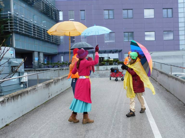 Društvo Rdeči noski še vedno, kljub epidemiji razveseljuje otroke in najstnike v zdravstvenih ustanovah in starostnike v domovih za starejše. Obiskujejo jih v parkih, pod balkoni in okni pa tudi preko zaslonov.