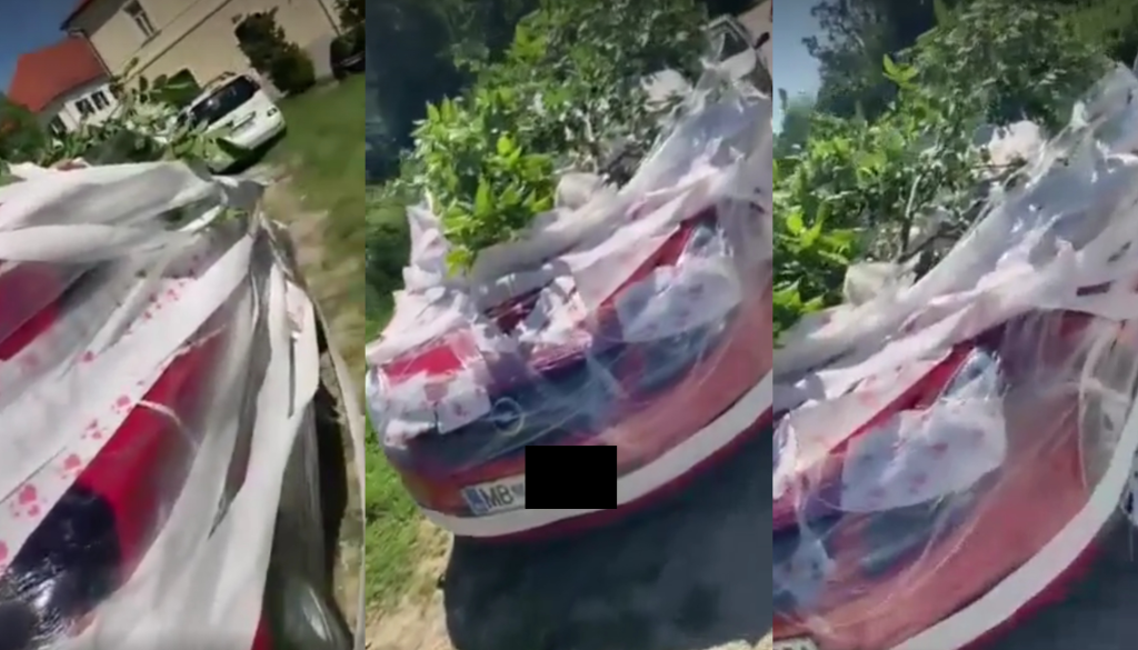 V uredništvu smo prejeli posnetek avtomobila, zavitega v plastično folijo in okrašenega z vejevjem in zelenjem. Tako presenečenje je pričakalo učiteljico Osnovne šole Velika Nedelja.