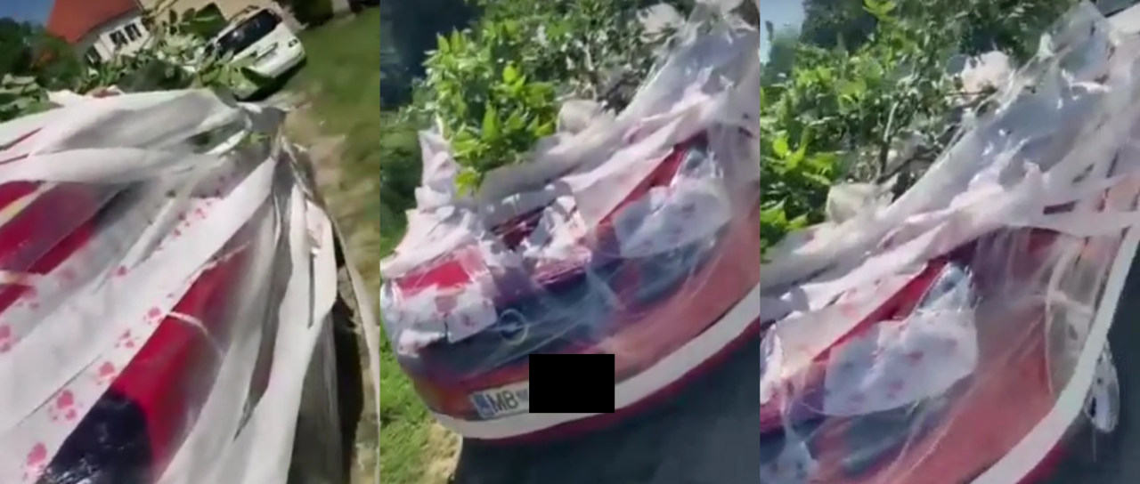 V uredništvu smo prejeli posnetek avtomobila, zavitega v plastično folijo in okrašenega z vejevjem in zelenjem. Tako presenečenje je pričakalo učiteljico Osnovne šole Velika Nedelja.