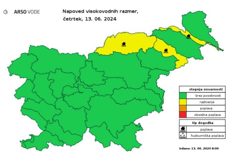 Danes popoldne bodo ob krajevno močnejših padavinah lahko na teh območjih hitro narastejo posamezni hudourniških vodotoki.