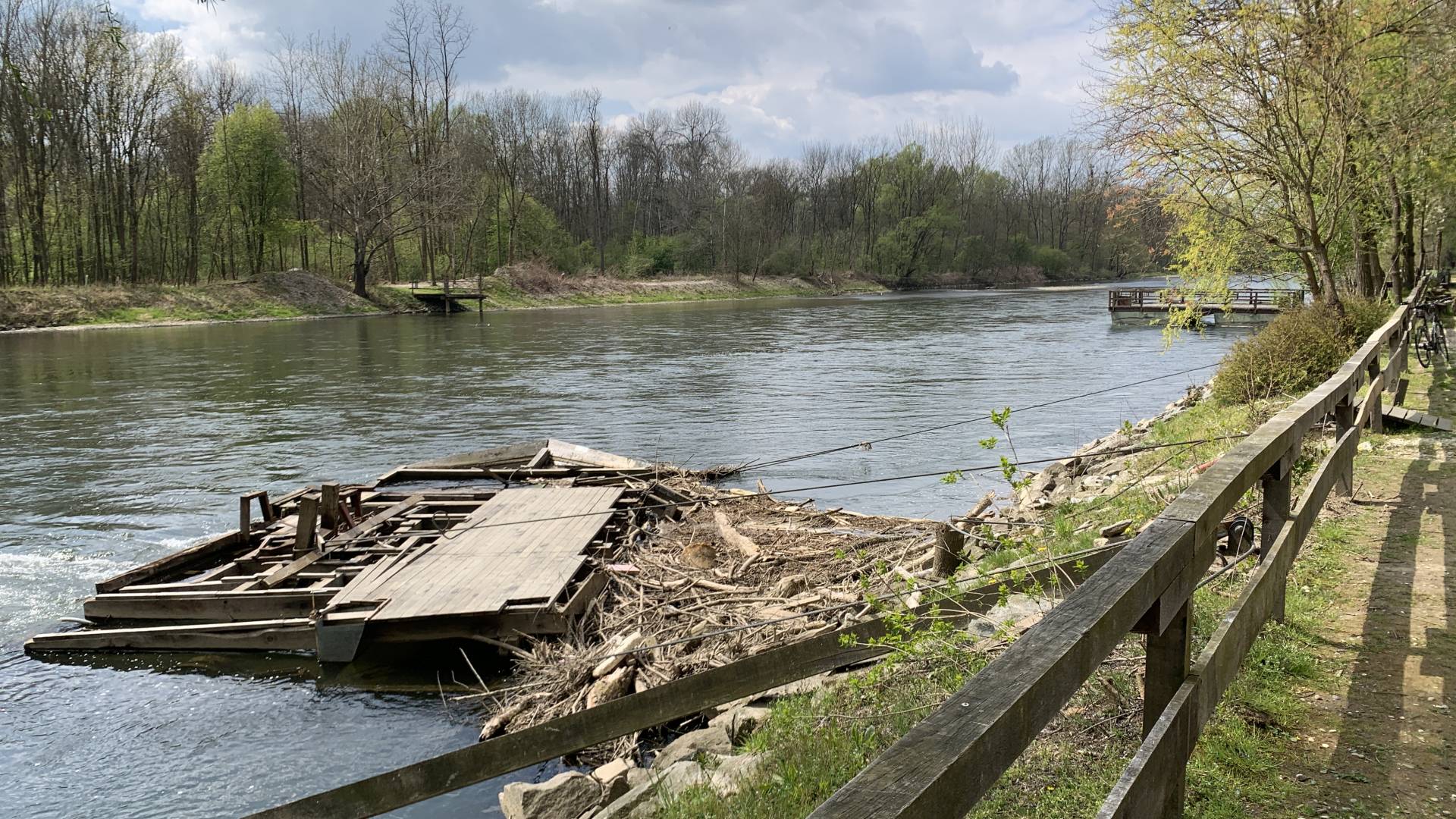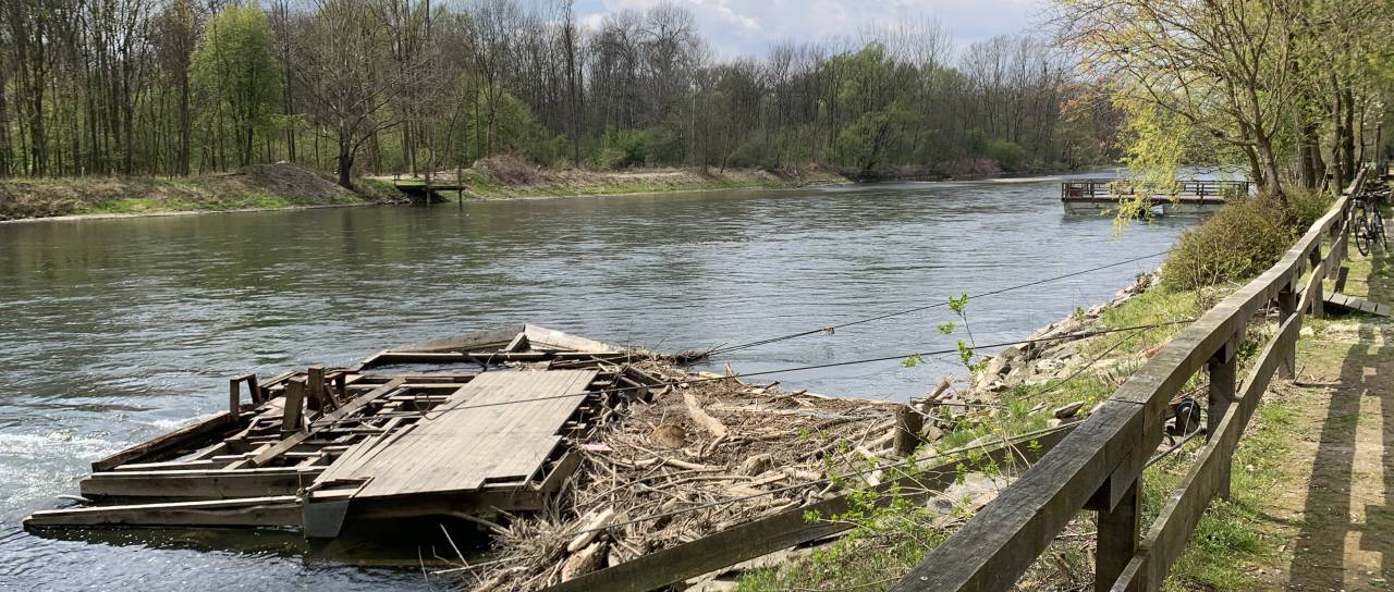 Ostanki porušenega mlina na Muri na Otoku ljubezni še vedno v vodi, od porušitve minilo že več kot pol leta.