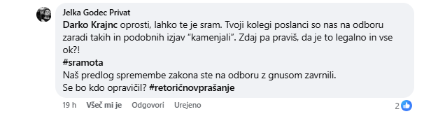 »Darko Krajnc oprosti, lahko te je sram. Tvoji kolegi poslanci so nas na odboru zaradi takih in podobnih izjav 'kamenjali'. Zdaj pa praviš, da je to legalno in vse ok?!« je zapisala.