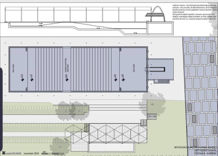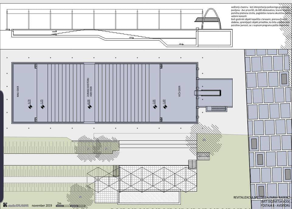 Kot nam je v telefonskem pogovoru pojasnil radenski župan, je zemljišče, na katerem se je doslej nahajal bazen, že pripravljeno na nadaljnja dela. Glede na načrte naj bi na tem območju zrasel avditorij v bazenu oziroma svojevrsten prireditveni oder z dvema prizoriščema, ki bi sprejel do 600 obiskovalcev: