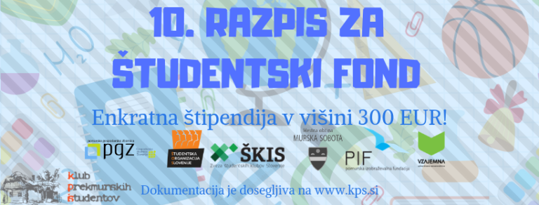 Klub prekmurskih študentov objavlja že 10. razpis za pridobitev enkratne štipendije iz sklada Študentski fond za študente v socialni stiski.
