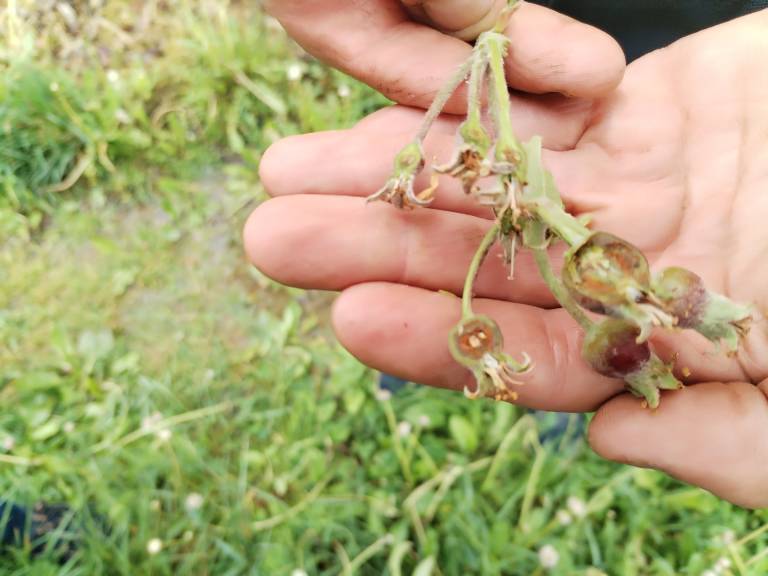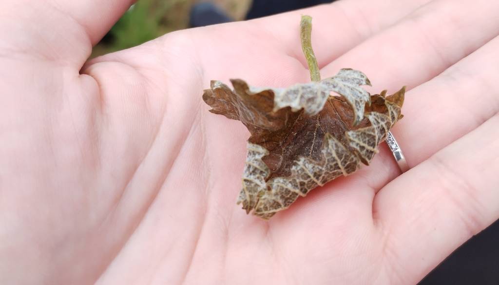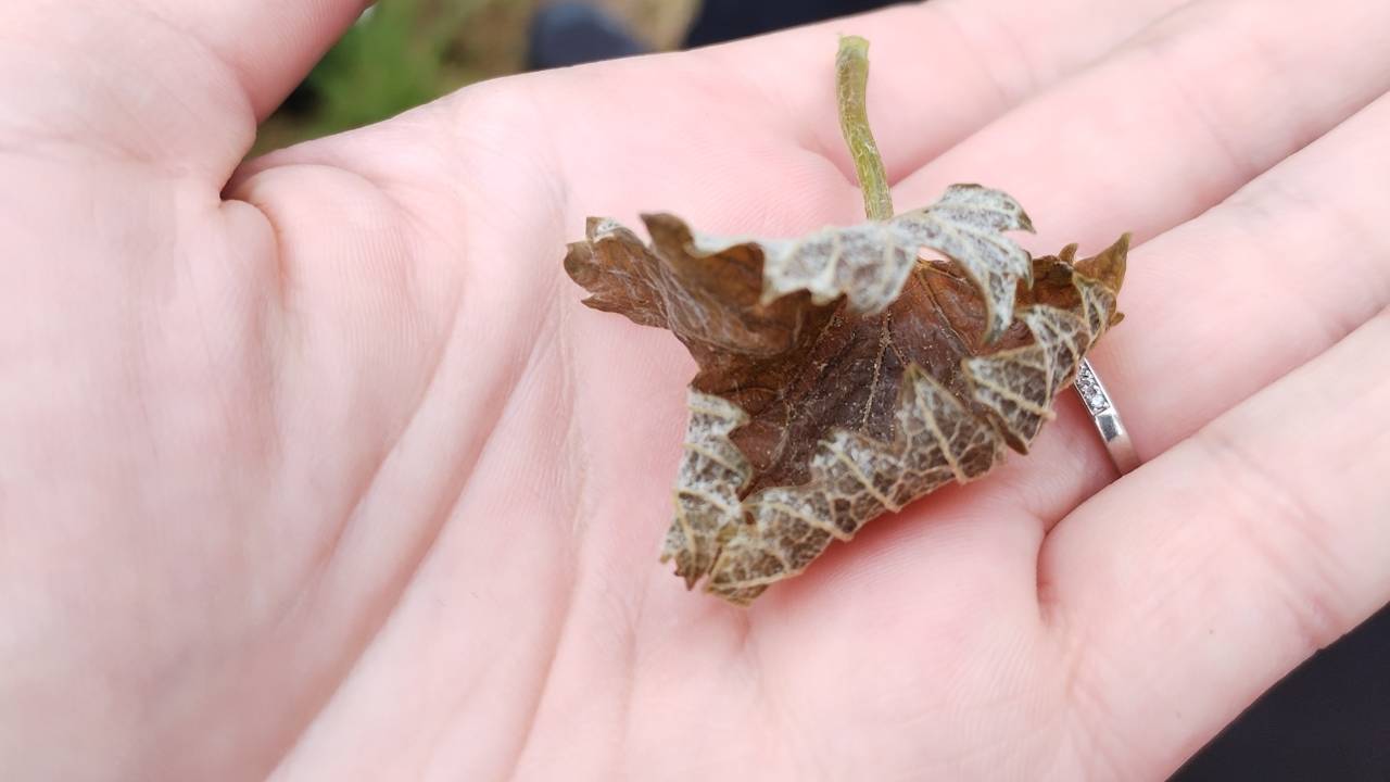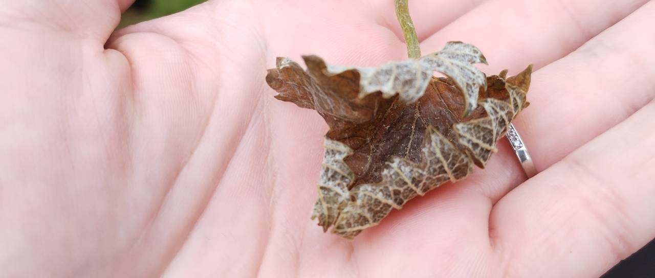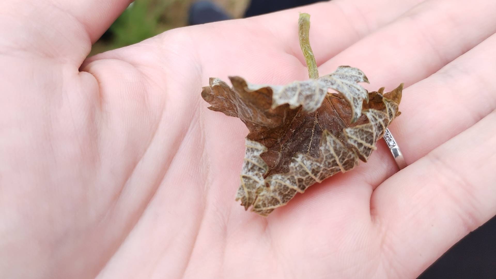 Posledice pozebe so že dobro vidne - kabrnki in listje so požgani in povešeni, tkiva popolnoma propadla.