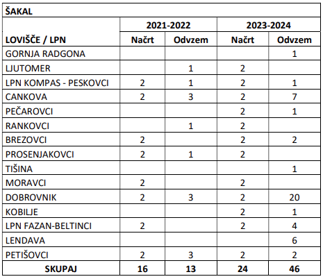Skupno so v zadnjih dveh letih odstrelili kar 46 šakalov. Prostorska razporeditev odvzema kaže na verjetnejšo prisotnost vrste v loviščih ob madžarski meji.