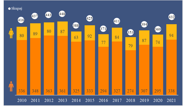 V absolutnih številkah to pomeni, da je zaradi samomora v letu 2021 umrlo 432 oseb (od skupno umrlih 23 261 v letu 2021), od tega je bilo 338 moških in 94 žensk.