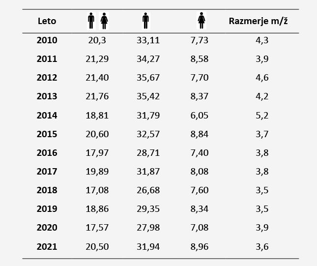 Razmerje med spoloma v letu 2021 je bilo 3,5, kar pomeni, da so moški več kot trikrat pogosteje umirali zaradi samomora v primerjavi z ženskami.