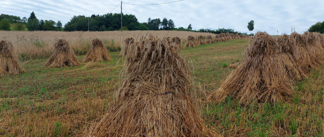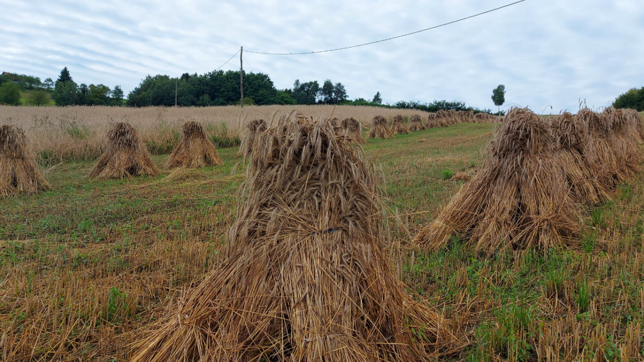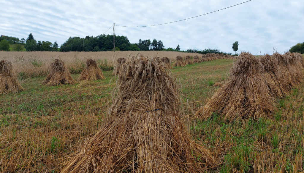 Redko viden prizor v današnjem času: Shranjevanje pšenice v snopih.