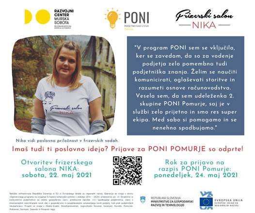 Nika Peternelj se je programu PONI pridružila z zavedanjem, da so za vodenje podjetja, poleg frizerskih veščin, zelo pomembna tudi podjetniška znanja. Predvsem si je s pomočjo mentorjev in drugih strokovnjakov želela pridobiti znanja na področju računovodstva, komuniciranja in oglaševanja storitev.