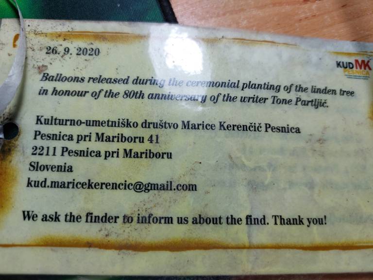 Organizatorji so na oba kompleta balonov obesili kartončke. Na njih je bilo sporočilo, namenjeno najditelju. Pozvali so, naj se jim oglasi.