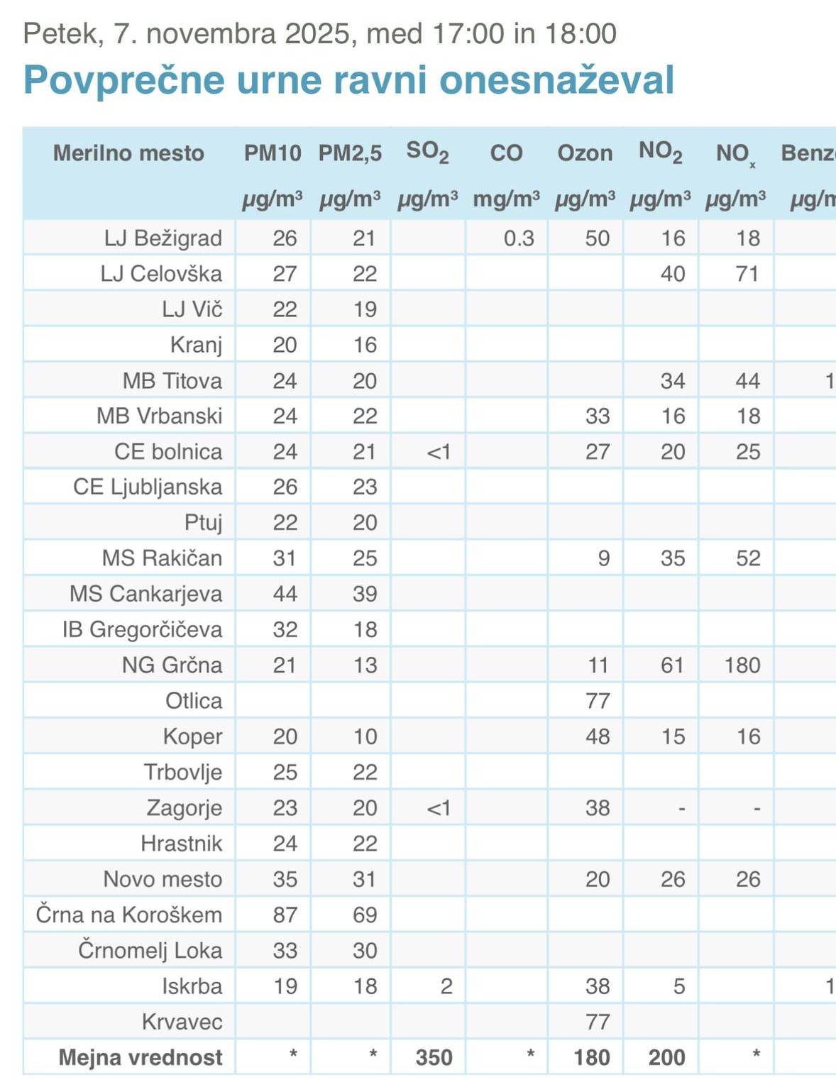 V petek, 7. novembra, med 17. in 18. uro, je merilna postaja Murska Sobota Cankarjeva zabeležila 44 mikrogramov na kubični meter delcev PM10 in 39 mikrogramov na kubični meter delcev PM2,5, kar je tik pod mejo dovoljenih vrednosti.