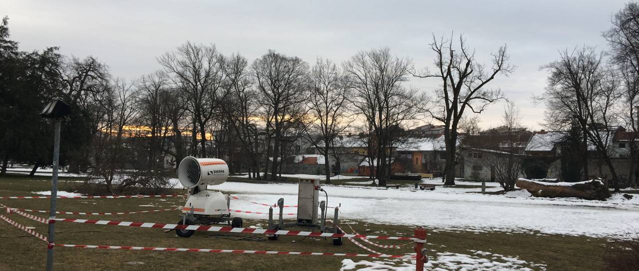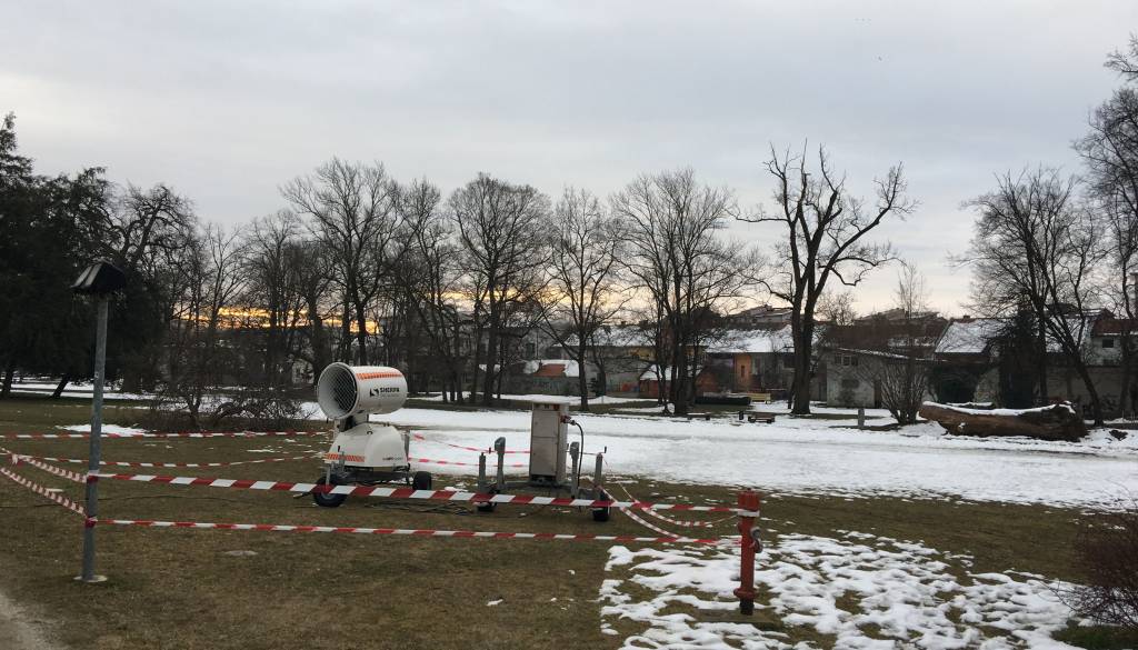 Pred dvema dnevoma so v Murski Soboti znova pognali snežni top, s pomočjo katerega naj bi na jasi ob gradu znova zraslo sankališče. Toda brez težav, kot kaže, ne bo šlo.