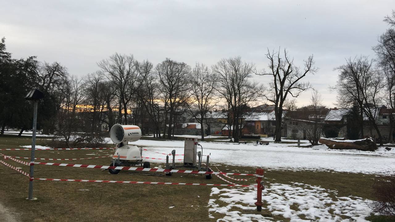 Pri zasneževanju brega v mestnem parku se je nekoliko zataknilo.