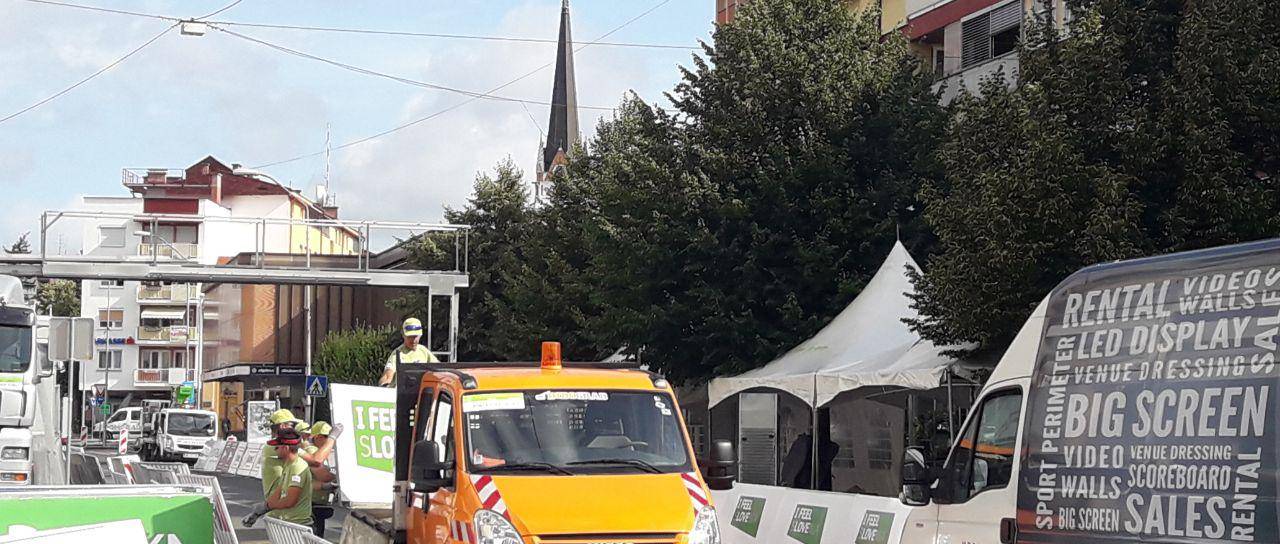 Kot je razvidno iz priloženih fotografij, so na soboških ulicah, po katerih se bo vila karavana kolesarjev, že postavljene zapore ceste. Ob Šopingu so postavili stojnice, Slovenska ulica pa se medtem že spreminja v čisto pravo ciljno ravnino, na katero naj bi tekmovalci predvidoma zapeljali ob 17. uri.