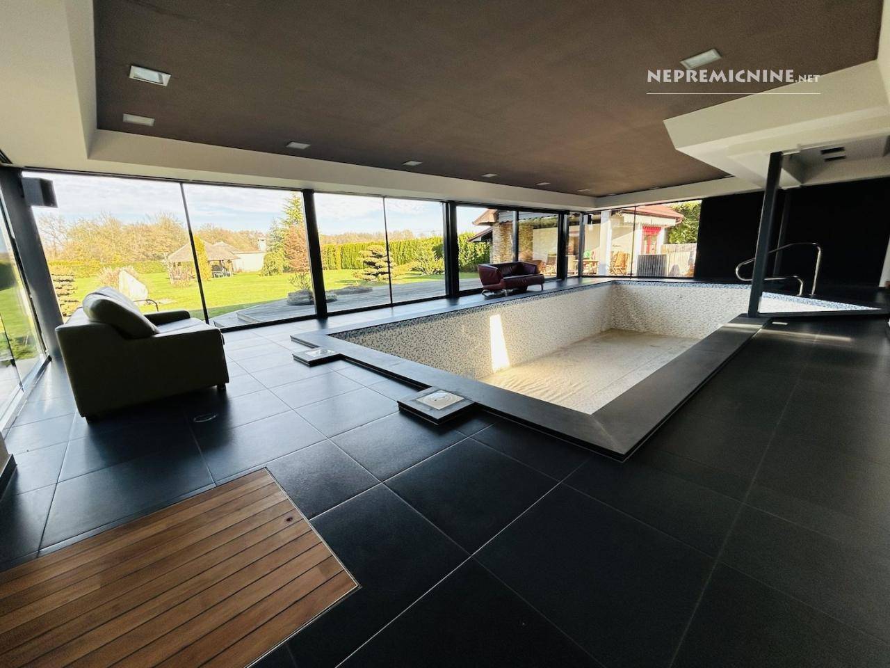 Osrednji bivalni del obsega prostorne, svetle prostore, moderno kuhinjo z jedilnico, več spalnic, kopalnico z jacuzzijem ter fitnes ali dodatno sobo. Posebnost hiše je notranji bazen z neposrednim dostopom do finske in infrardeče savne – popoln zasebni wellness kotiček.