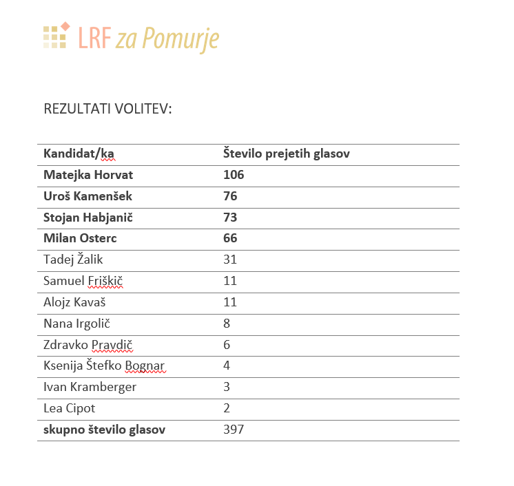 Na podlagi največjega števila glasov so predstavniki nevladnih organizacij v Razvojnem svetu pomurske regije postali: Matejka Horvat, Uroš Kamenšek, Stojan Habjanič in Milan Osterc, so sporočili iz LRF Pomurje.