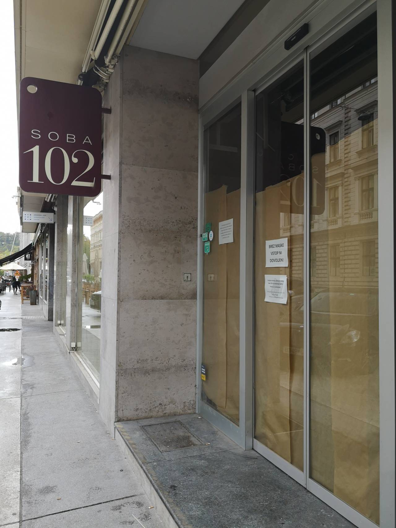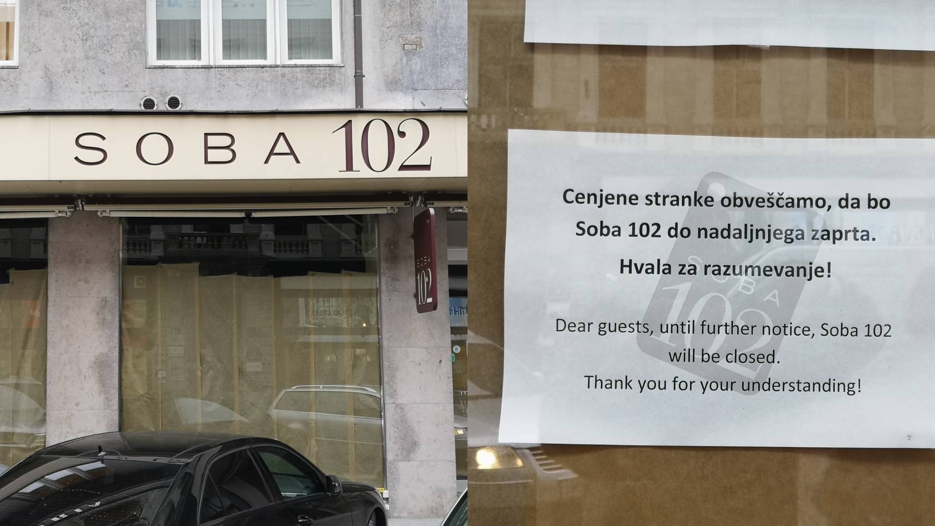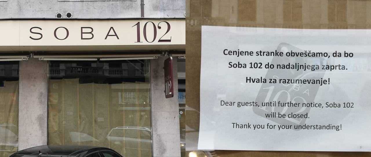 Na vratih restavracije je napisano: »Cenjene stranke obveščamo, da bo Soba 102 do nadaljnega zaprta. Hvala za razumevanje!«