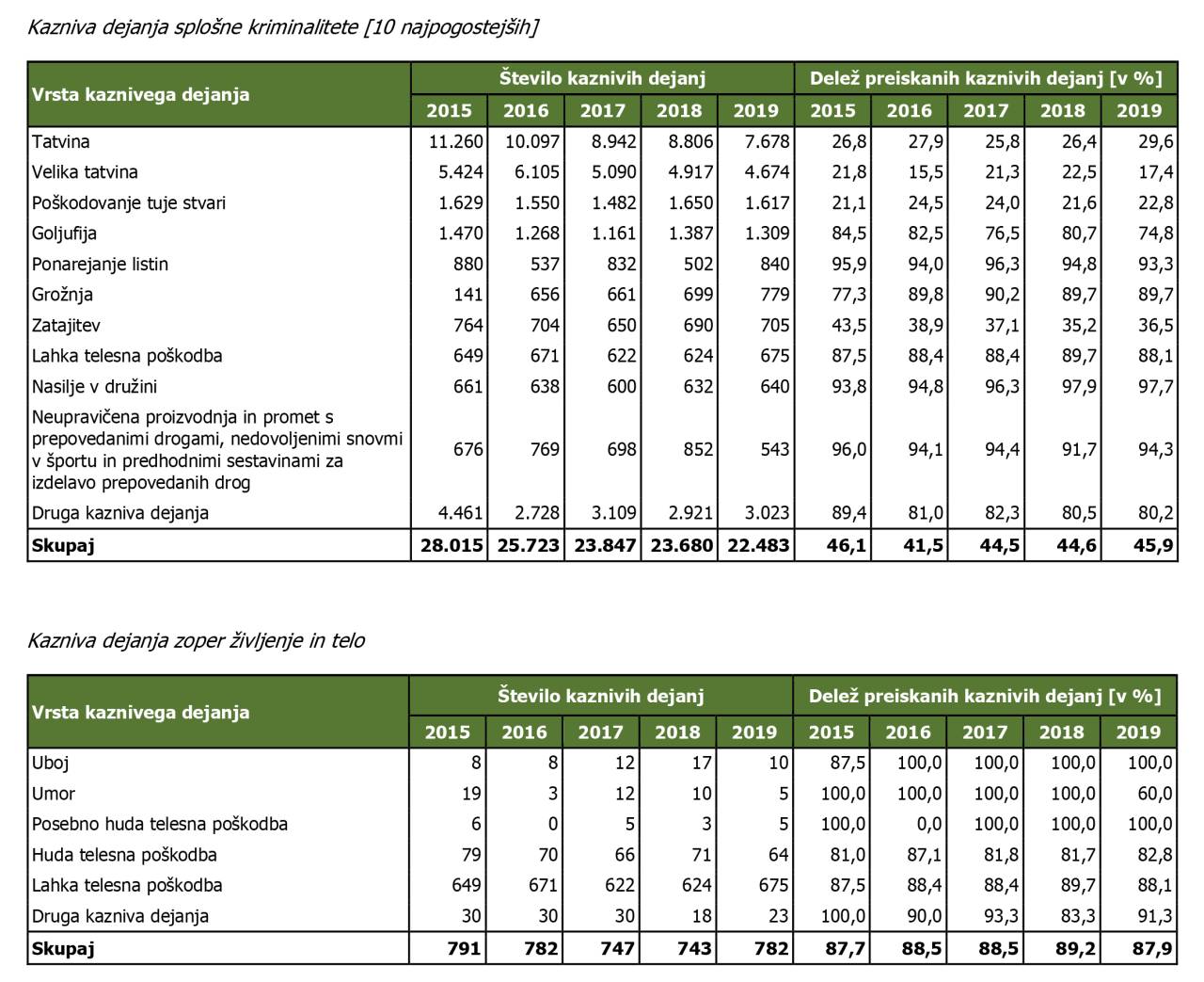 Glede na kazniva dejanja so policisti na ravni države obravnavali največ tatvin (7.678), velikih tatvin (4.674), poškodovanja tujih stvari (1.617), goljufij (1.309) in ponarejanja listin (840) v prvem polletju 2019. Pri kaznivih dejanjih zoper življenje in telo so obravnavali 10 ubojev in 5 umorov, kar je manj kot v primerljivem obdobju lani (17 ubojev in 10 umorov).