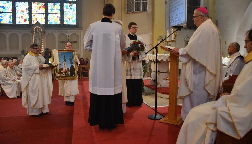 Dekana Ivan Kranjec in Boris Kučko so škofu izročili simbolična darila, med njimi kipa svetih bratov Cirila in Metoda ter fotoknjigo z dogodki njegovega delovanja.