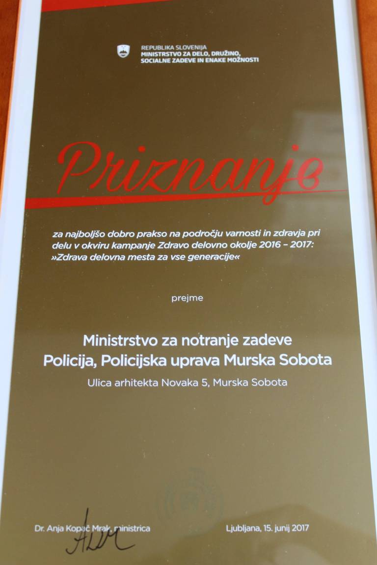 Murskosoboška policijska uprava si je s prizadevanji na področju zdravja na delovnem mestu prislužila prav posebni priznanji.