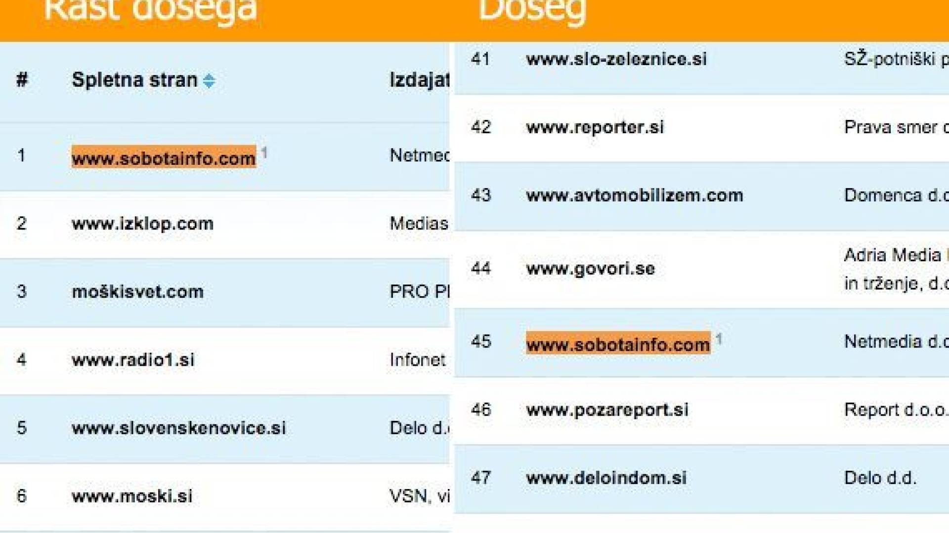Pomurski spletni medij Sobotainfo.com je v minulem mesecu zabeležil najvišjo rast branosti med vsemi slovenskimi spletnimi portali, so sporočili s Slovenske oglaševalske zbornice. V mesecu novembru je doseg Sobotainfo.com, v primerjavi z mesecem poprej, zrastel za kar 34,5 %. Po dosegu smo se tako uvrstili na 45. mesto, po številu prikazov pa na 32. mesto lestvice najbolj obiskanih spletnih strani, ki jo v sklopu projekta MOSS pripravlja Slovenska oglaševalska zbornica. Sobotainfo.com je poleg Primorskih novic, ki sicer pokrivajo občutno večje geografsko območje, tako edini regionalni spletni medij v Sloveniji, ki se je uvrstil med 50 najbolj obiskanih spletnih strani.