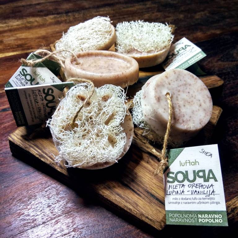 Na tržnici ponujajo izdelke iz lufe, kot so gobice za pomivanje posode in osebno nego, žepki za milo, masažne rokavičke in mila z lufo.
