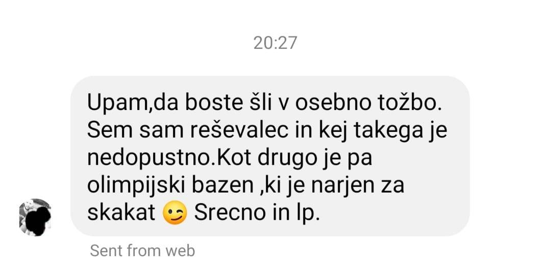 »... povem mu da ne bom več skakal in da me je seznanil s pravili da je vse ok. Vidim, da model ni čist gladek in predlagam da mi vrnejo denar za karte in grem vn..( na bazenu sem bil komaj 15min ). Ni želel in odplavam.«