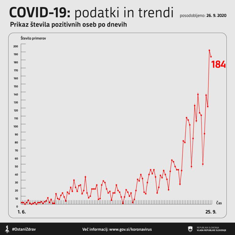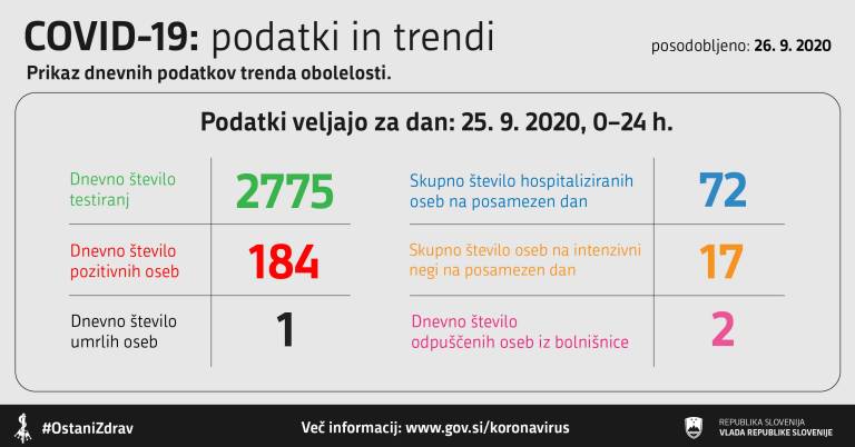 Včeraj, 25. septembra 2020, so v Sloveniji opravili 2775 testiranj na novi koronavirus. Potrdili so 184 novih okužb, kar je blizu rekorda, ki znaša 192 okužb v enem dnevu.
