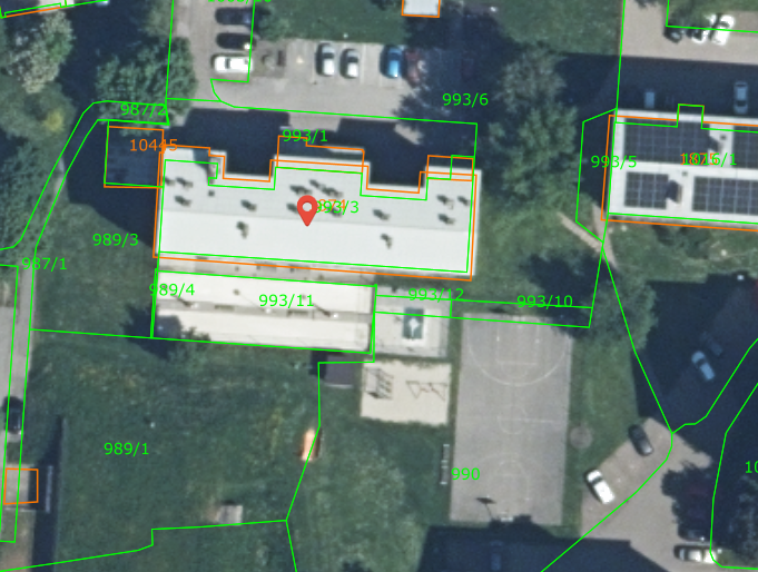 Med ogledom je bilo izpostavljeno, da rusko kegljišče, ki je bilo urejeno v času trajanja postopka, po ugotovitvah na terenu v celoti zajema parcelo 993/12, hkrati pa približno 0,95 metra posega še na sosednjo parcelo 993/6.