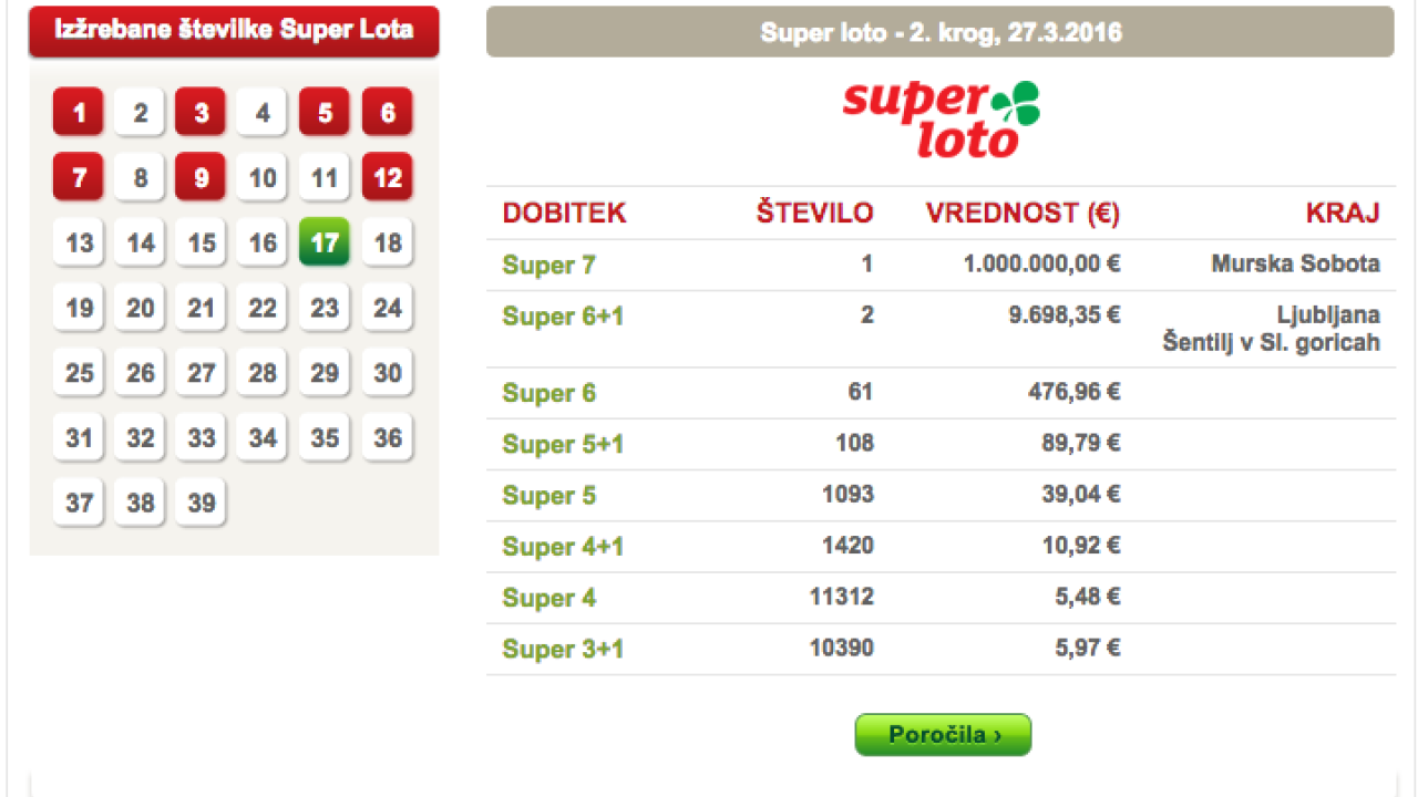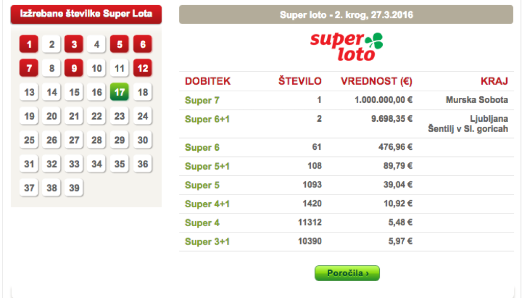 Sinoči je bil izžrebani zmagovalni dobitek igre Super Loto. Sedmica je bila vplačana v Murski Soboti.