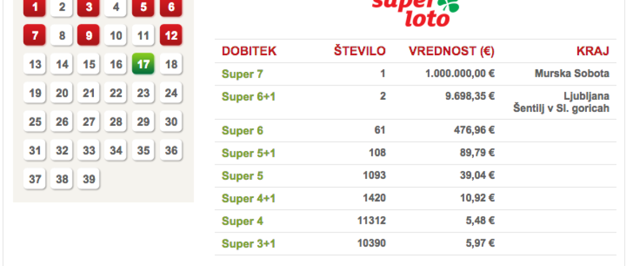 V igri na srečo Super Loto so sinoči izžrebali številčno kombinacijo 1, 3, 5, 6, 7, 9, 12 in 17. Listek z zmagovito kombinacijo je bil vplačan v Murski Soboti, zmagovalec pa bo bogatejši za milijon evrov.