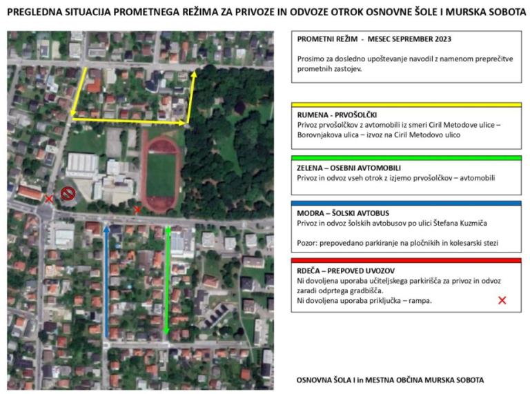 Mestna občina Murska Sobota je na svoji spletni strani objavila pregledno situacijo prometnega režima za privoze in odvoze otrok Osnovne šole I Murska Sobota.