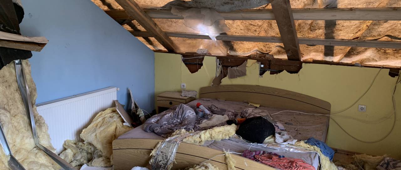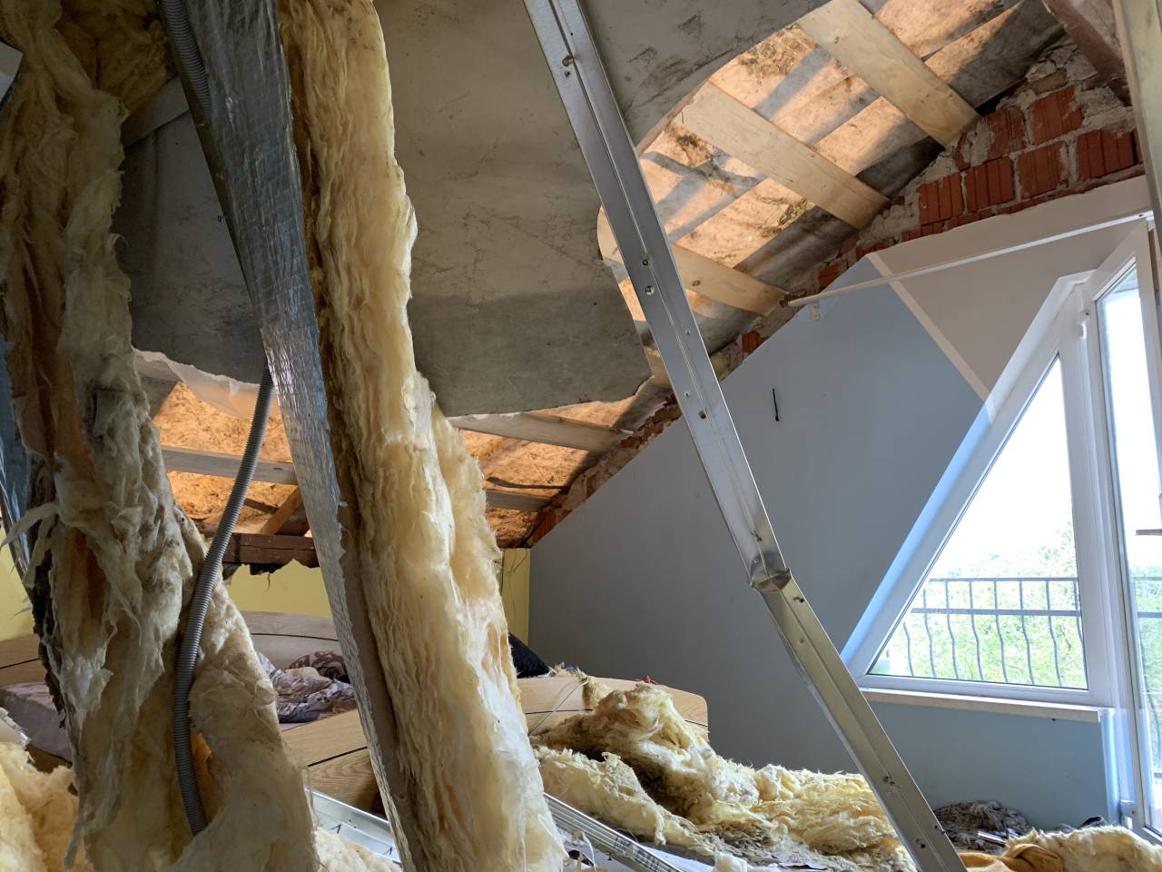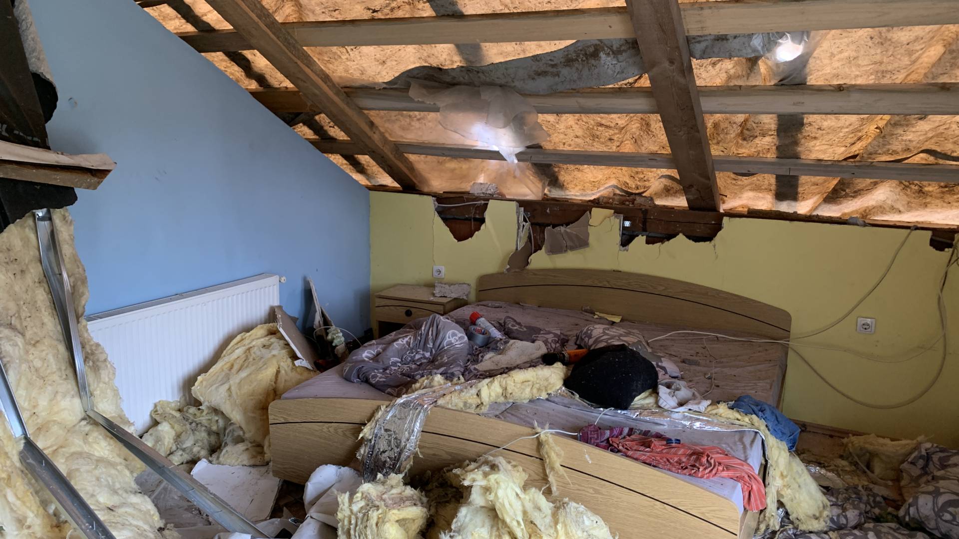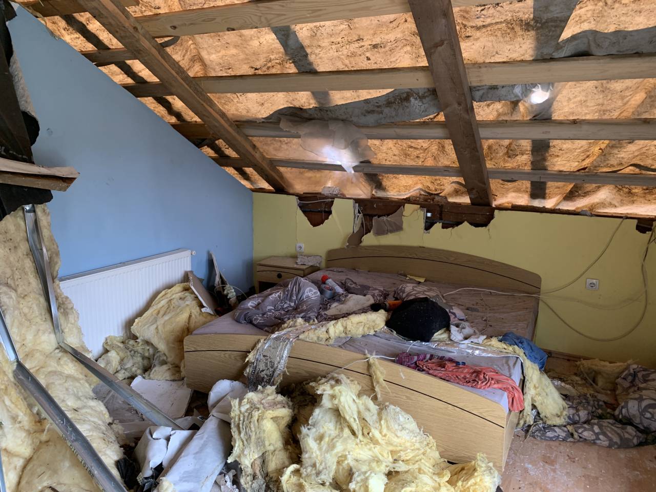 Neurje je s strešno kritino odneslo tudi izolacijo in mavčne plošče s konstrukcijo. Kopalnica, spalnica in otroška soba so tako brez stropa. K sreči v trenutku neurja osemletnega otroka ni bilo v svoji sobi. "Hvala bogu ni počival tu v svoji sobi, ker ga v tem primeru več ne bi imeli. Počival je v dnevni sobi, hvala bogu," pravi Sanja Lašič Zadravec.