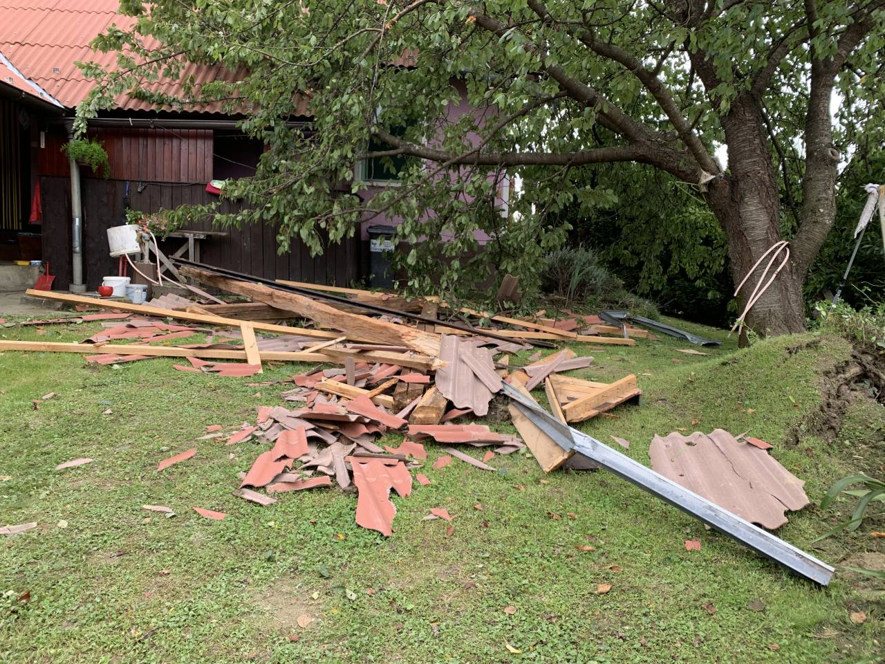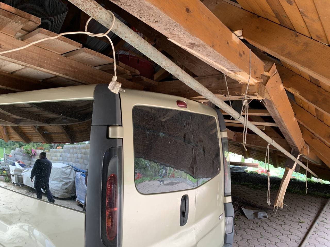Branko Zadravec je med neurjem sprva stal na dvorišču, a se nato še uspel pravočasno umakniti na varno v garažo. Nadstrešek za avtomobile je tik za tem veter premestil za nekaj metrov. "Dvignilo ga je v zrak, obrnilo in vrglo na tla," je povedal lastnik hiše. Pod podrtim nadstreškom so tako ostali trije družinski avtomobili.