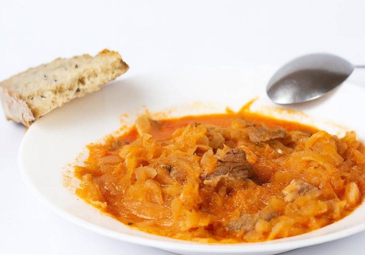 Na maščobi prepražimo na kocke narezano čebulo, dodamo rdečo papriko, zalijemo z vodo in dodamo narezano meso. Začinimo s soljo, lovorjem in česnom ter dušimo do mehkega.