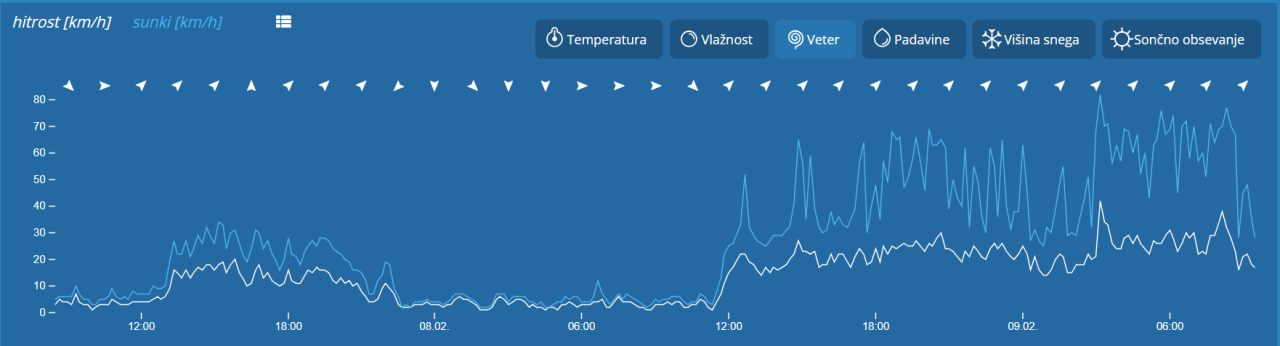 Ob 5.40 je postaja izmerila sunek vetra 76 kilometrov na uro, pol ure za tem pa 74 kilometrov na uro.