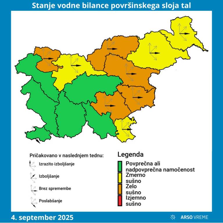 Za obdobje po 12. septembru so napovedi še negotove, vendar večje količine padavin niso pričakovane. Sušne razmere se zato v večjem delu države verjetno ne bodo bistveno izboljšale.