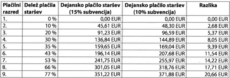 Za starše se bo cena glede na njihov plačilni razred povečala, kot je prikazano v spodnji razpredelnici.