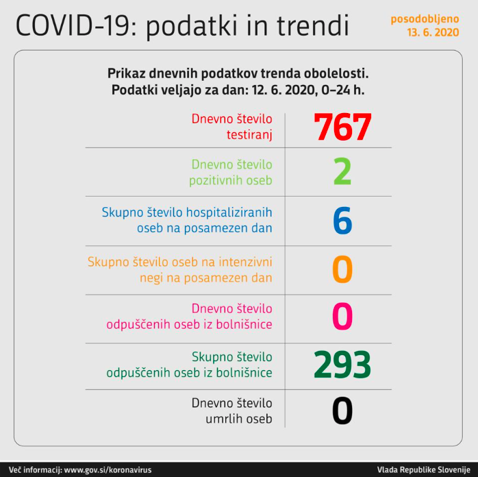 V Sloveniji so v petek po vladnih podatkih ob 767 testiranjih potrdili dve novi okužbi s koronavirusom, umrla pa ni nobena oseba s covidom-19.