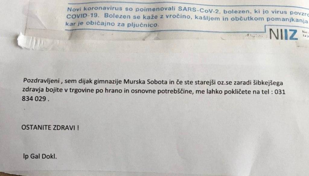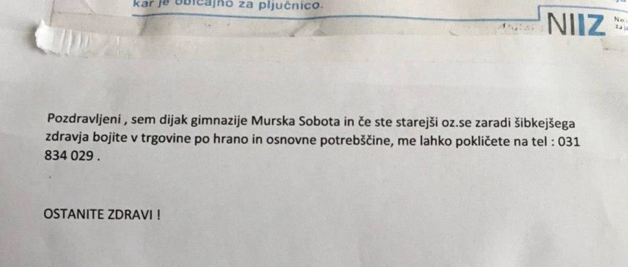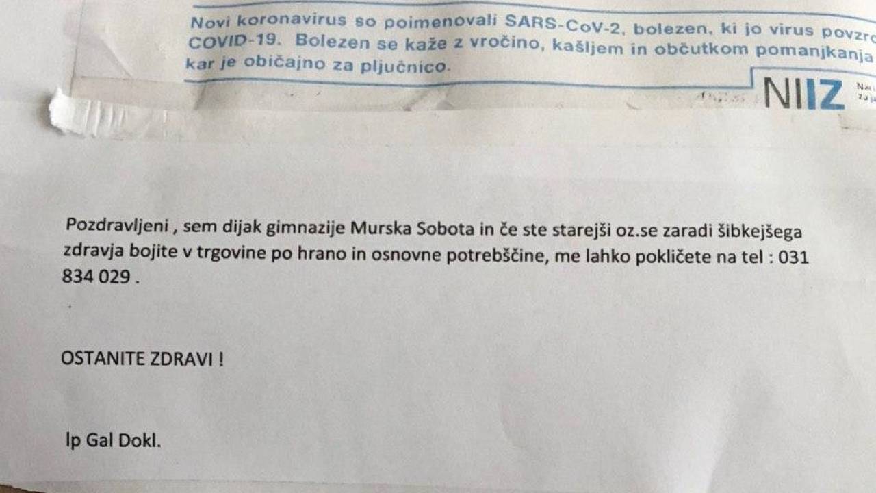»Pozdravljeni, sem dijak Gimnazije Murska Sobota in če ste starejši oziroma se zaradi šibkejšega zdravja bojite v trgovine po hrano in osnovne potrebščine, me lahko pokličete. Ostanite zdravi,« je sporočilo, ki smo ga opazili na steni enega izmed blokov v Murski Soboti.