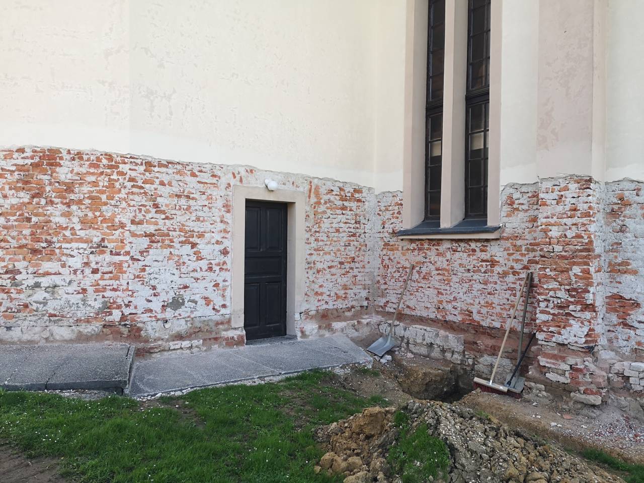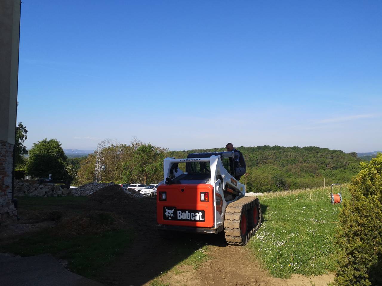 Od ranega jutra tudi na delovnem stroju pomaga pri delih v okolici cerkve, ki so jo prisiljeni prenoviti zaradi zasičenosti zidov z vlago. Počasi se je sesedala in propadala.