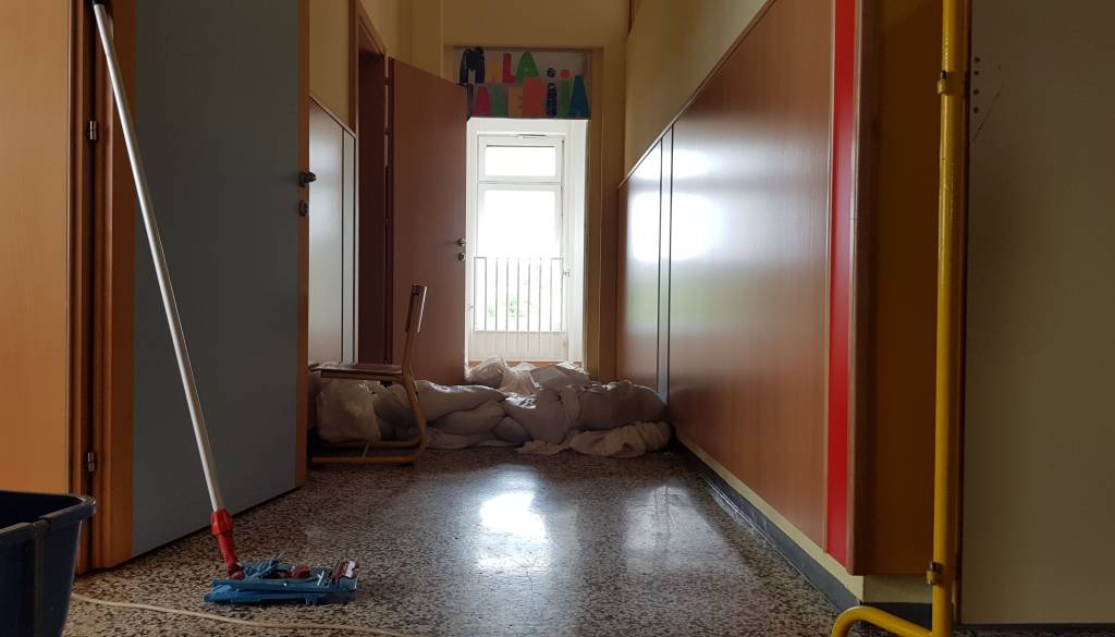 Na praznih hodnikih je še zdaj moč videti protipoplavne vreče, s katerimi so zaposleni poskušali zmanjšati škodo, ki jo je povzročilo neurje. Knjige so prekrite s folijo, parket se je napil vode in je uničen. Veliko razočaranje je moč zaznati tudi med učitelji, ki se namesto s poučevanjem ukvarjajo s saniranjem škode.