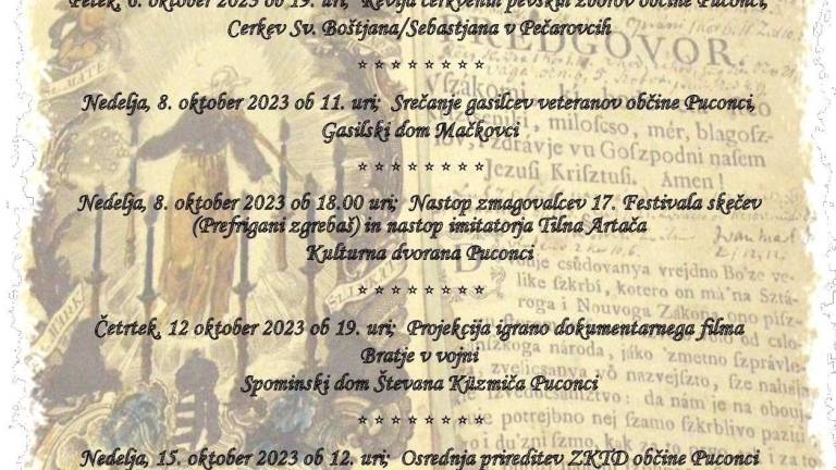 - Petek, 6. oktober 2023 ob 19. uri: Revija cerkvenih pevskih zborov občine Puconci v cerkvi Sv. Boštjana/Sebastjana v Pečarovcih.