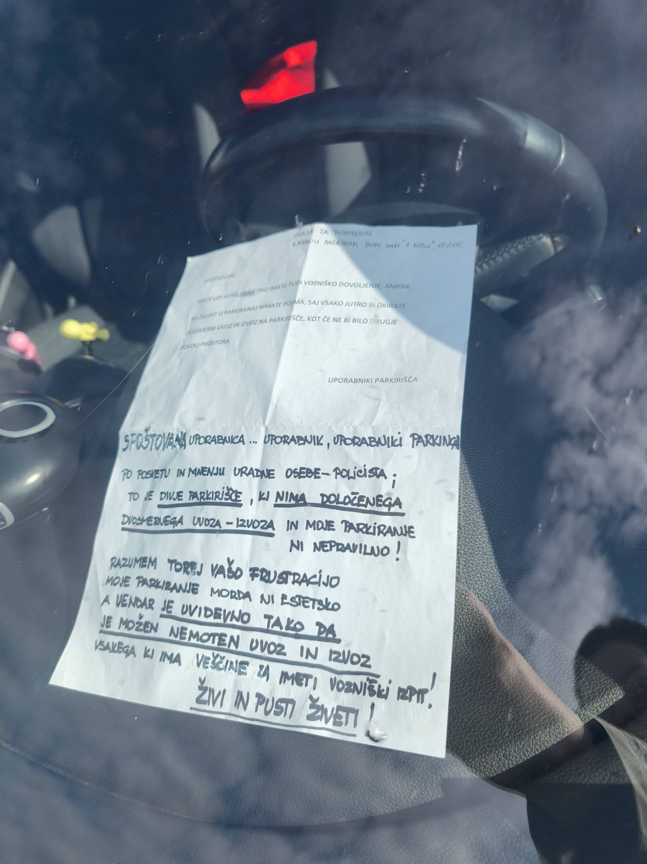 »Spoštovani, imate lep avto, verjetno imate tudi vozniško dovoljenje, ampak na žalost o parkiranju nimate pojma, saj vsako jutro blokirate dvosmerni uvoz in izvoz na parkirišče, kot če ne bi bilo drugje dovolj prostora.