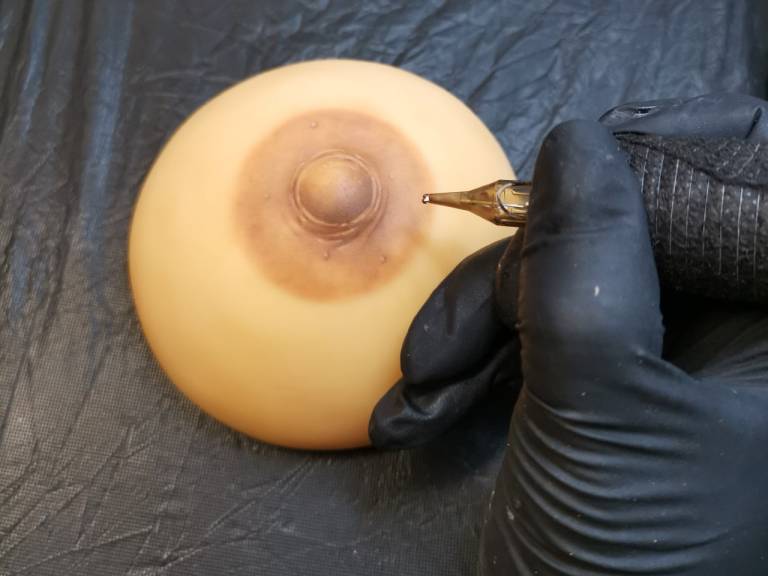 Pred tetoviranjem areole ima Nives s svojo stranko posvet v svojem studiu. Ogleda si stanje, brazgotine, debelino kože, ali je rekonstrukcija same bradavice uspela ali ni izbočena.