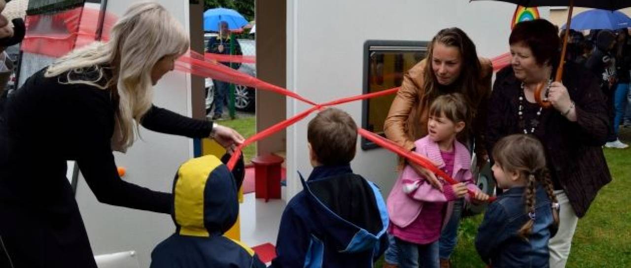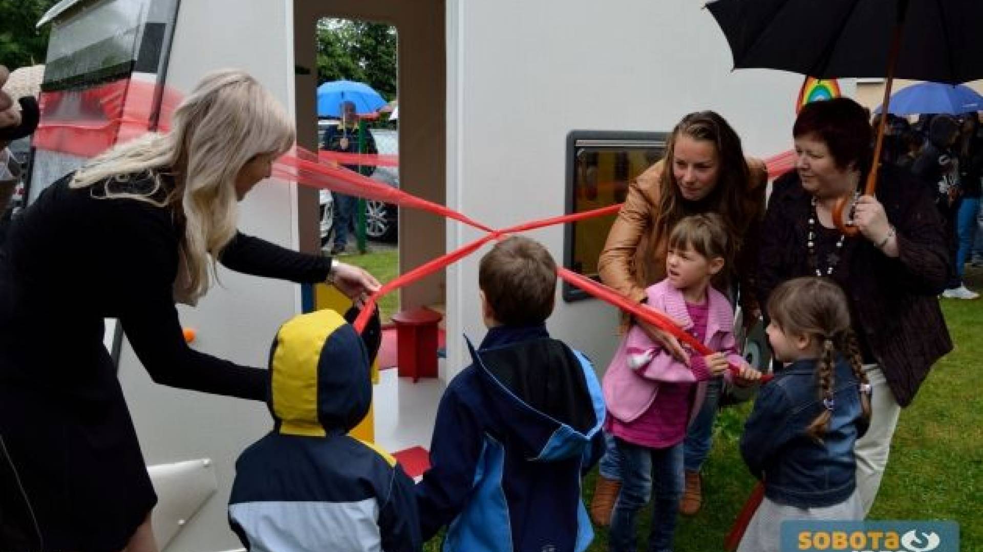 Kljub deževnemu dnevu so se otroci osnovne šole in vrtca Odranci ob petju in plesu veselili nove pridobitve na njihovem igrišču, saj bodo lahko uživali v edinstvenem, modernem in pisanem avtodomu, izdelanem posebej za njih.