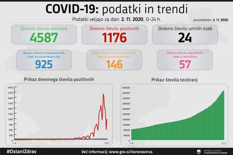 V Sloveniji so v ponedeljek, 2. novembra, opravili 4587 testiranj na koronavirus in potrdili 1176 novih okužb, delež pozitivnih je bil 25,64 odstotka vseh testiranih.