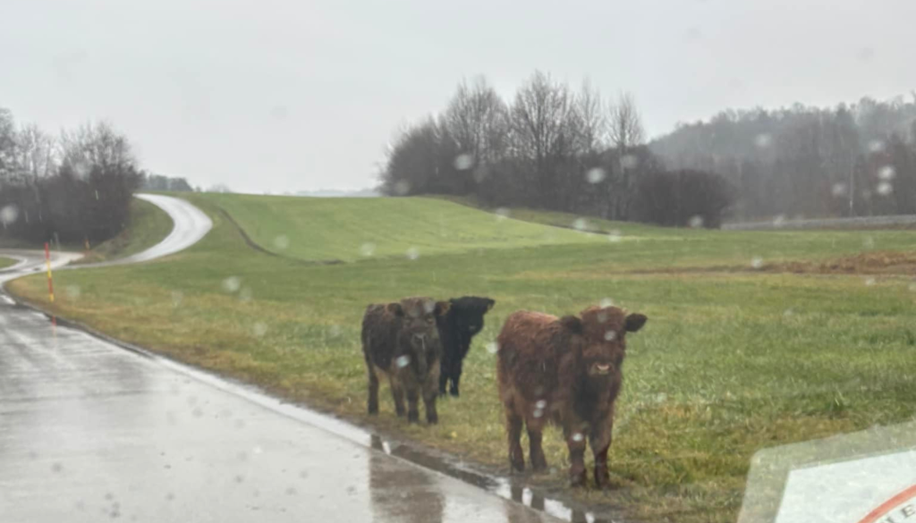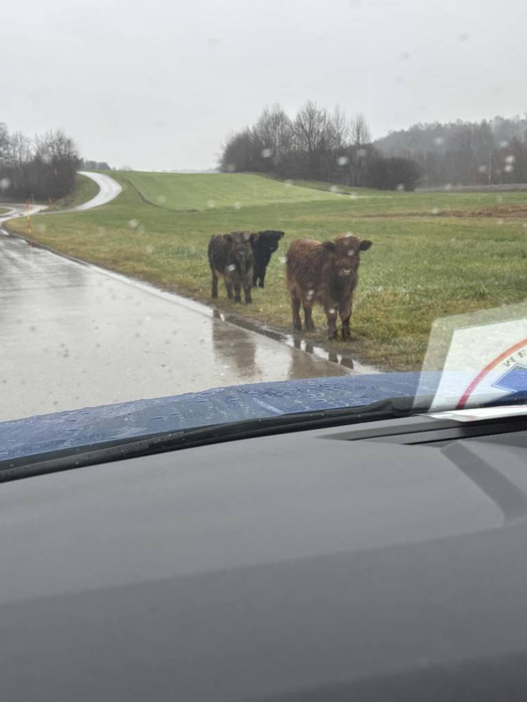 Danes zjutraj so vozniki na cesti iz Lahoncev proti Ivajnkovcem naleteli na nenavadno situacijo. Tri mlada goveda so se sproščeno sprehajale po robu mokre in spolzke ceste.